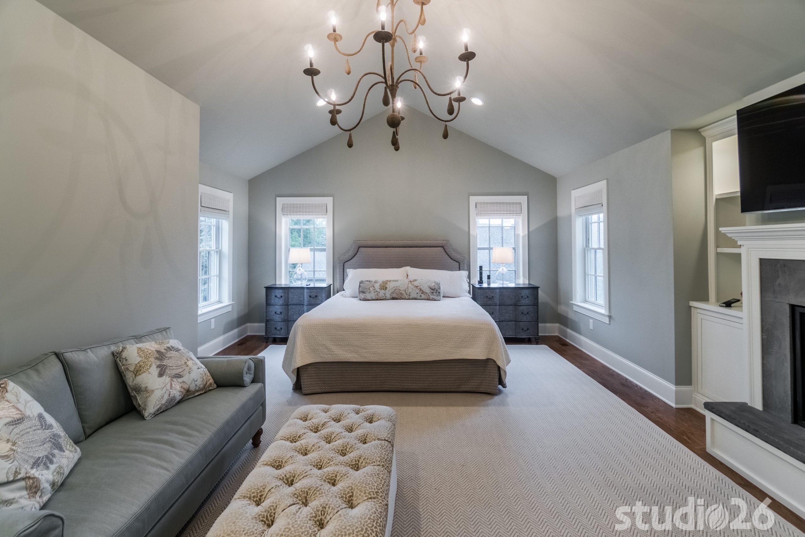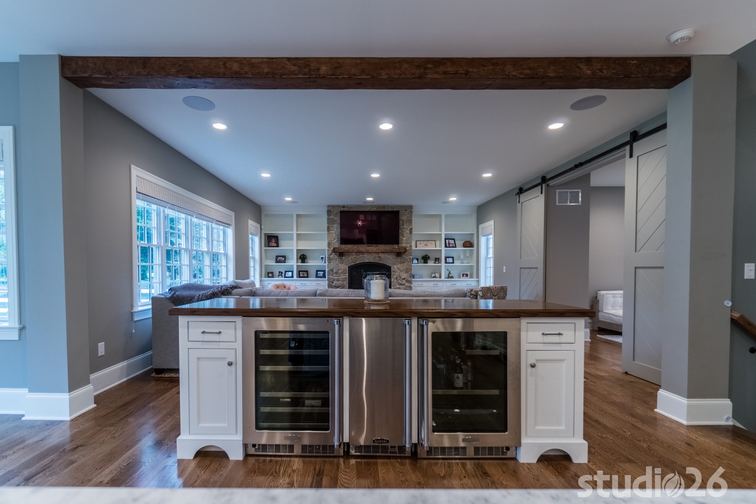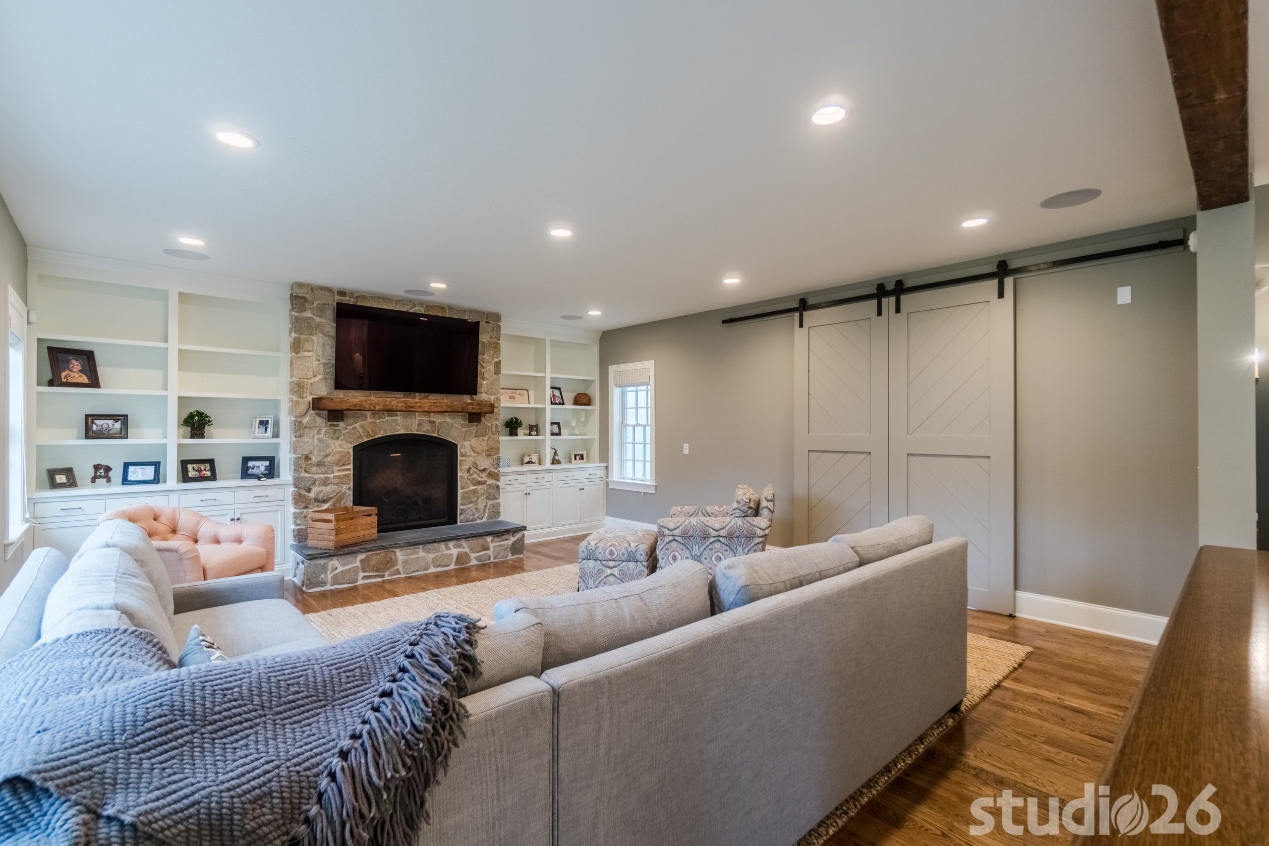 Programmatically, our client was looking to capture a few of the cherished elements of their former home while incorporating several new and larger components that would help them to better entertain their plentiful extended family and friends throughout the holidays and special occasions. To help deliver on this goal, it was important for us to incorporate an expansive covered front porch with its black standing seam metal roof as well as an extensive rear covered porch area that housed a custom outdoor kitchen, a wood-burning stone fireplace, and toasty infrared heaters recessed into the bead board ceiling perfect to help expand the entertaining seasons throughout the year.