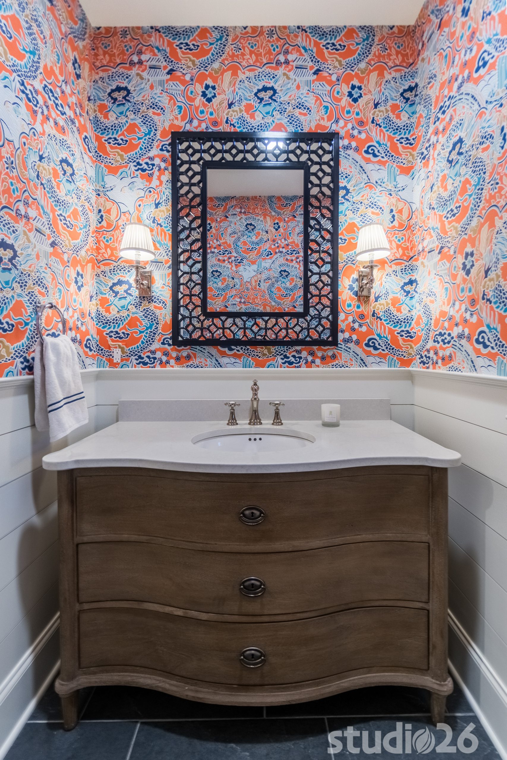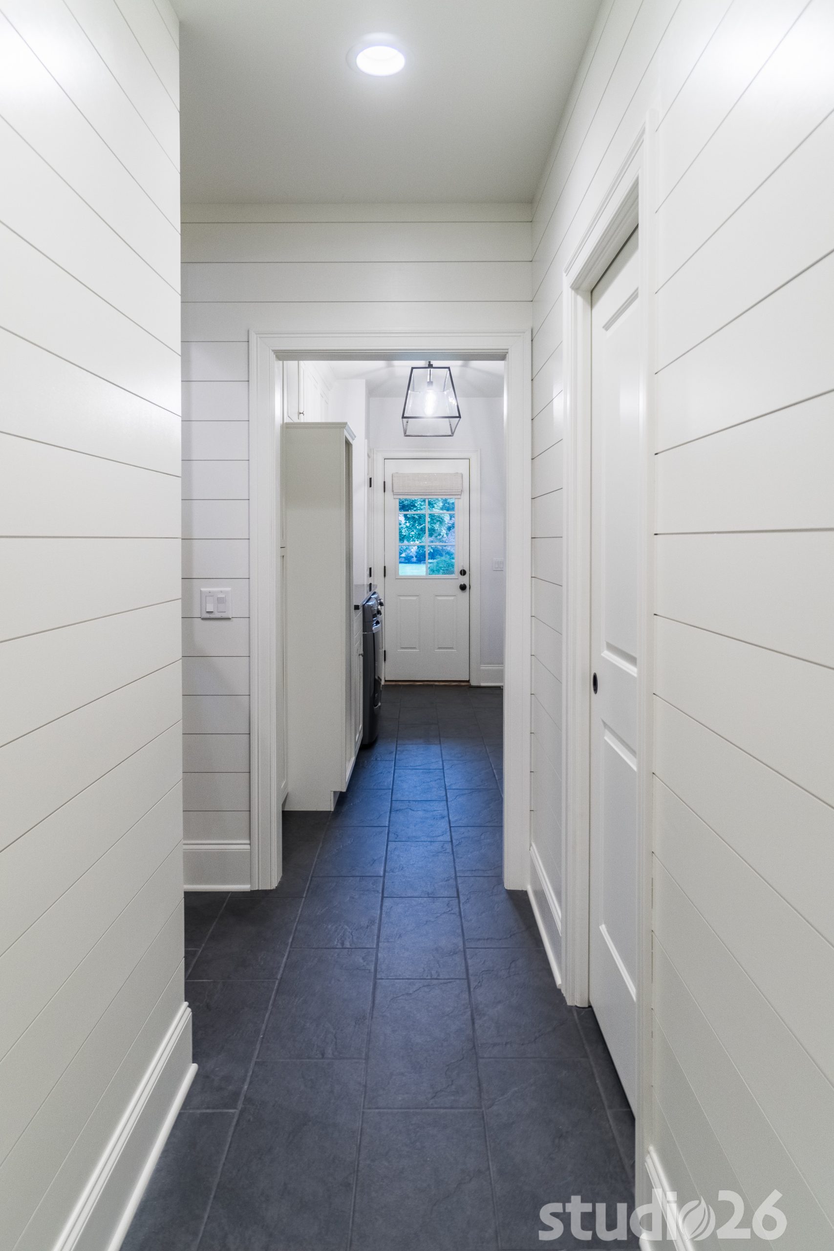 Passing by the formal dining room on the left and the much-needed kids’ play room on the right, you enter into the large luxurious kitchen, which opens directly into the great room anchored by its robust stone fireplace and flanking custom built-ins. This kitchen would be a dream for any accomplished home chef both functionally – with its high-end appliances (including a separate beverage center, wine fridge, and ice maker located on a second and distinct island), two sinks, loads of counter space, and lots of hidden storage – and aesthetically – with its timeless materials, sculptural and ambient lighting, graceful design details, and comforting hues. Just off the kitchen rests a private hallway veneered in horizontal shiplap; which leads to the large functional mud room complete with custom locker built-ins, a washer, dryer, and sink, a large walk-in pantry, and a private and stylish powder room.
