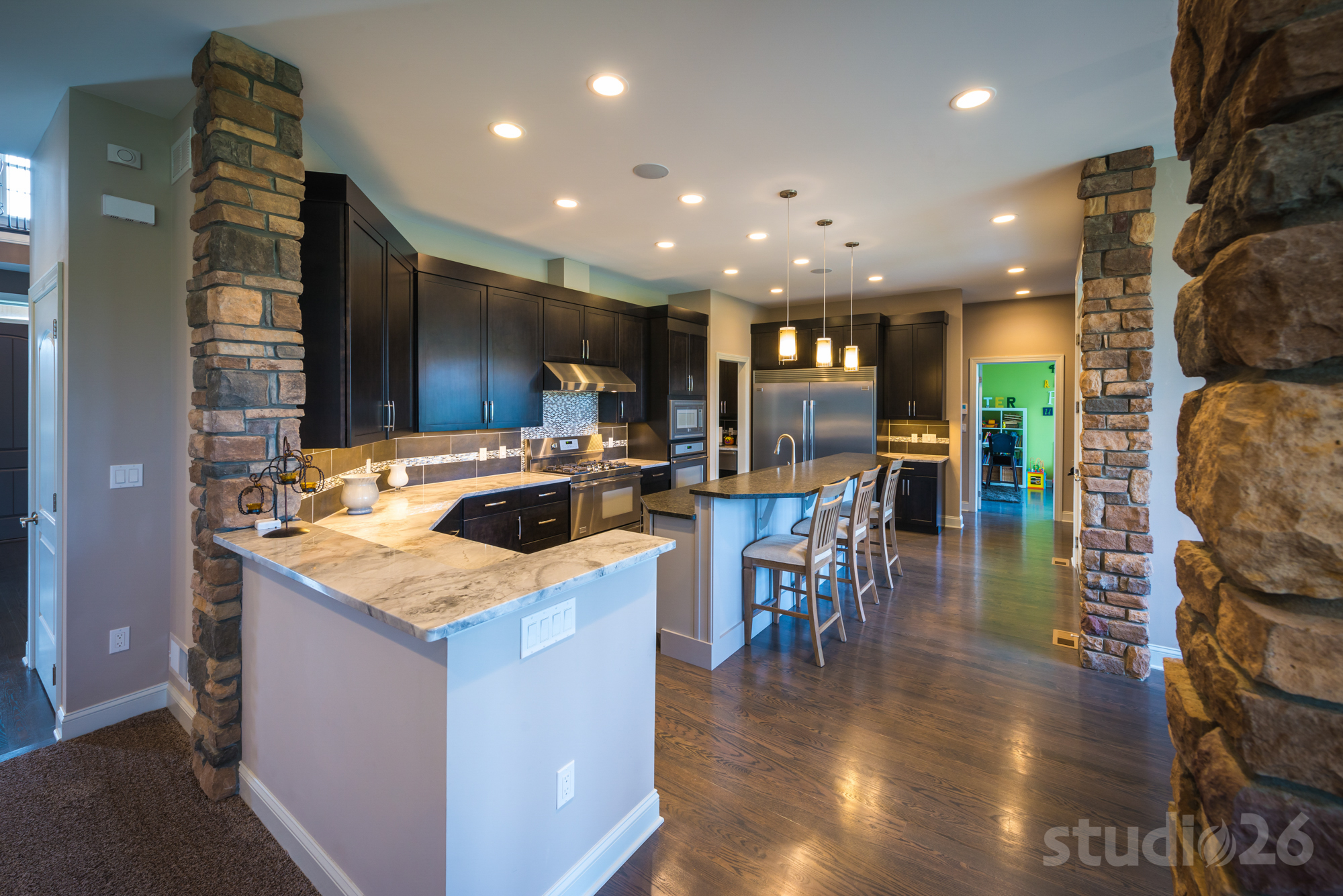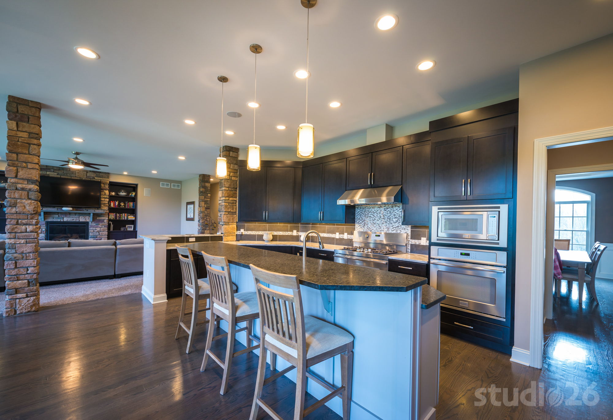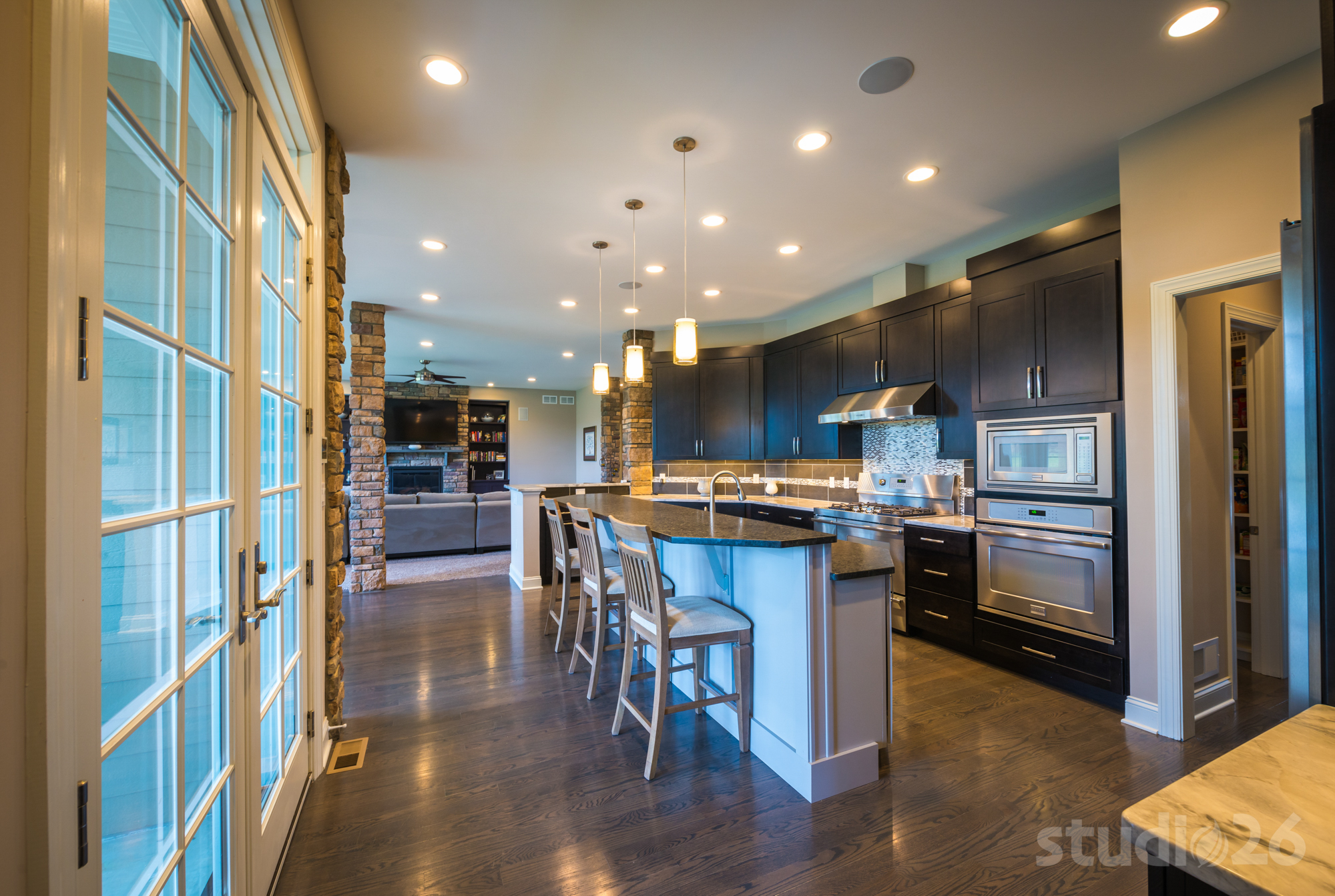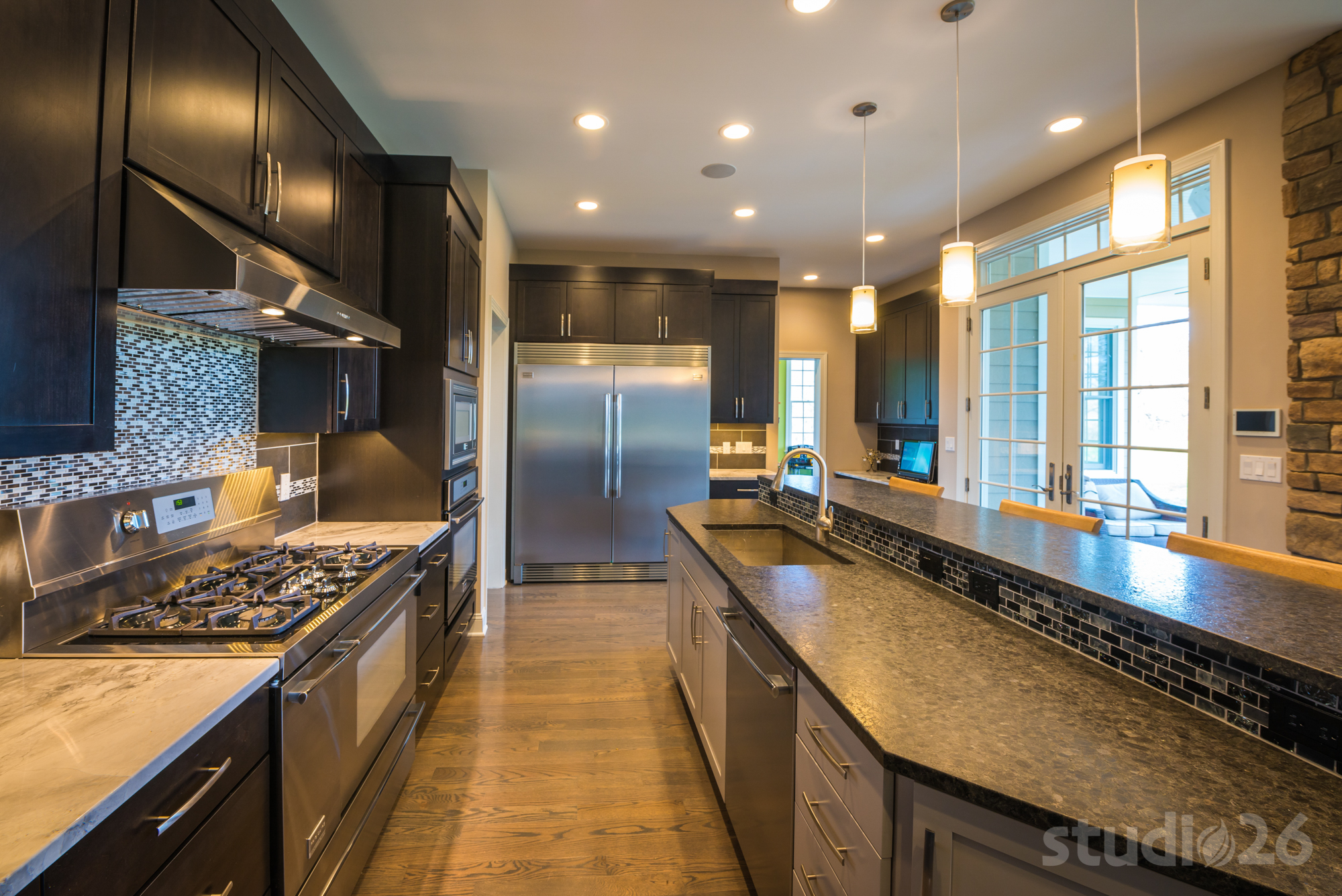 - State-of-the-art kitchen with slate-stained cherry cabinetry, stainless steel appliances, granite countertops, decorative tile backsplash, walk-in pantry, butler’s pantry, functional desk area