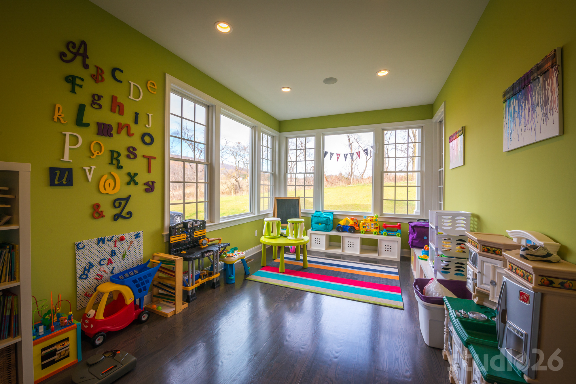 - 10’ first floor and 9’ second floor ceilings with grey-stained locally harvested, oak hardwood flooring throughout