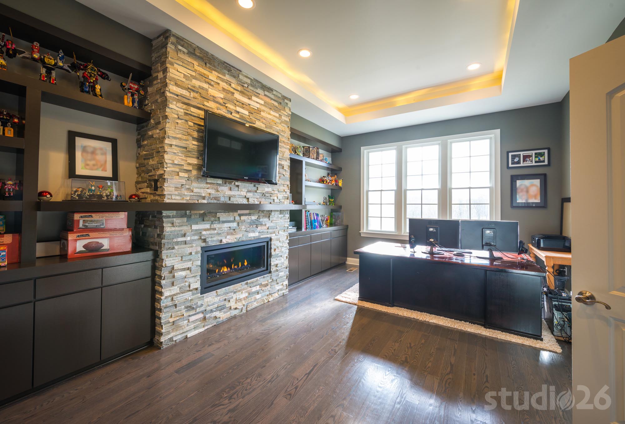 - Modern-designed library with single, clean-edged coffered 11’ high ceiling, custom built-in cabinetry, and central stone fireplace to help anchor the room
