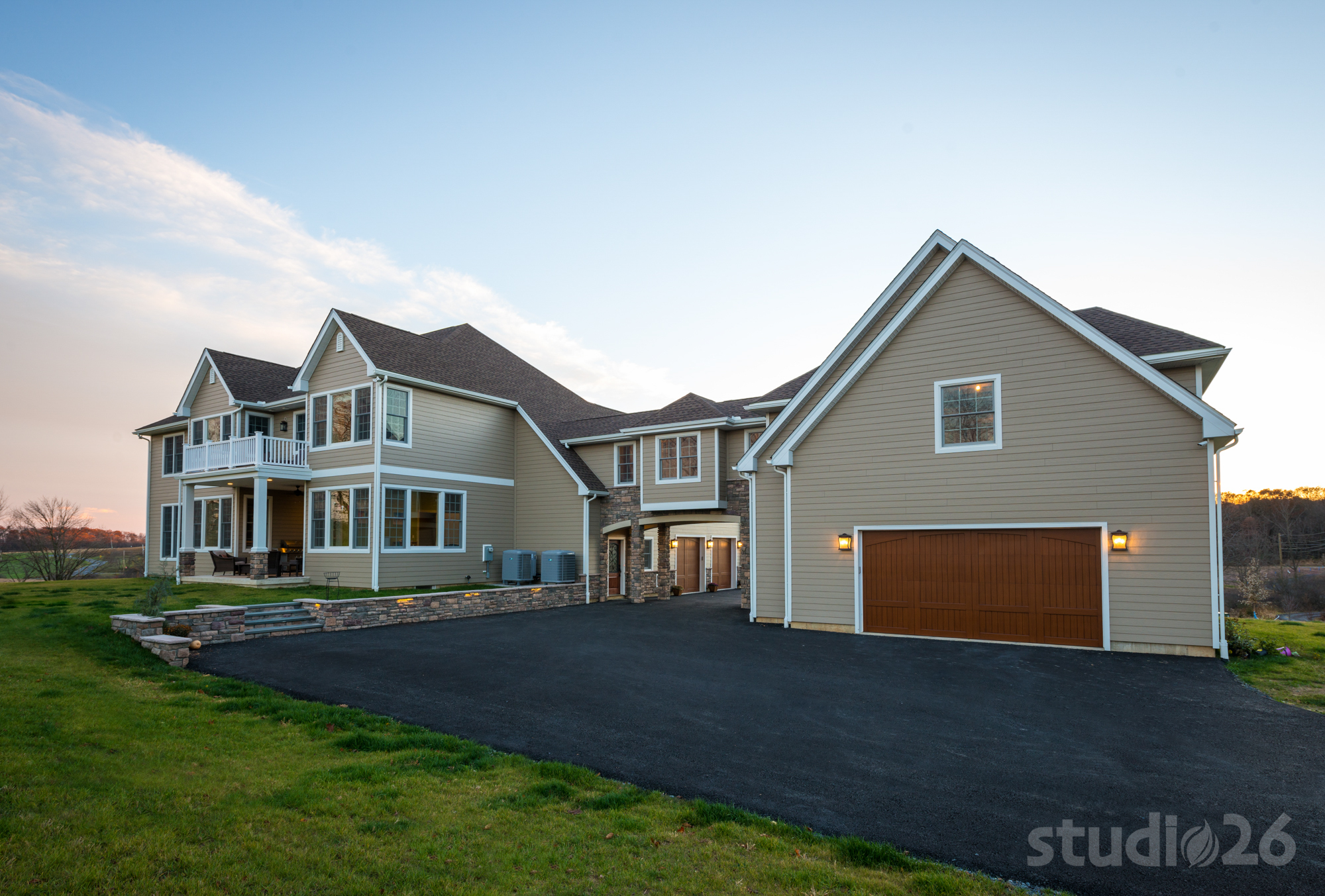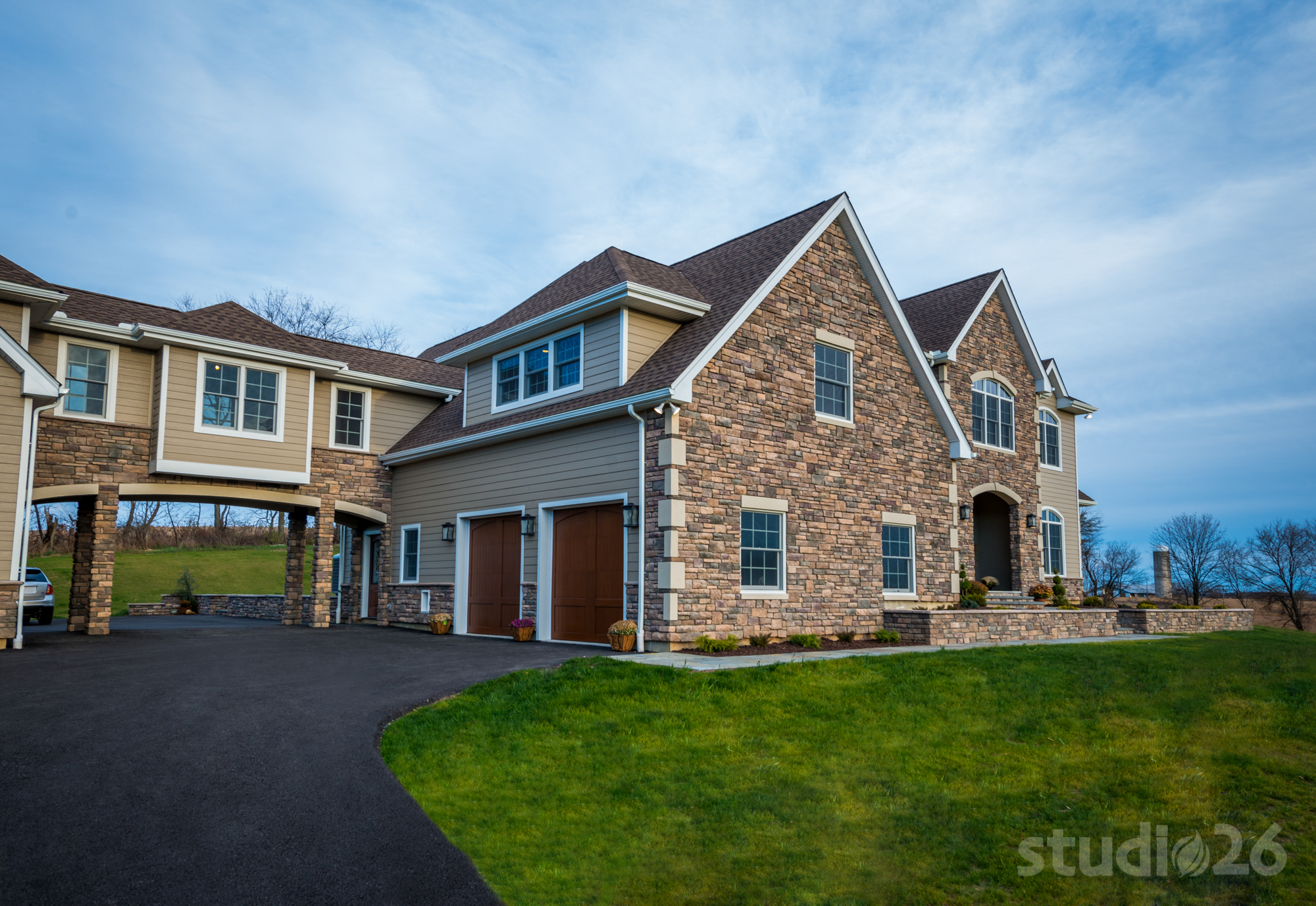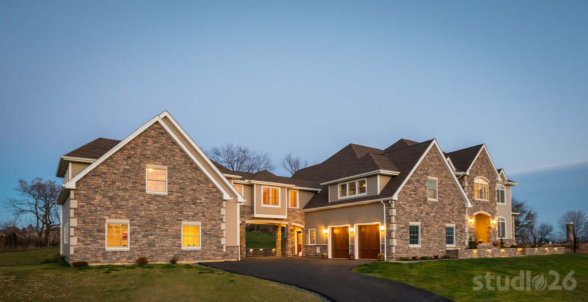 Similar to some of our custom home projects, this process began with a collaborative and exhaustive search for a suitable 10+ acre countryside parcel on which to build a dream estate. After several weeks perusing options together, our client selected a property that offered a private, yet picturesque backdrop complete with expansive open space and nearby mountain views. To help maintain privacy as well as convey an ‘escalated’ sense of arrival, the driveway was designed from the public street to meander along a nearly 1,000’ long driveway traversing an existing tree-lined creek at three separate crossings and just beyond, ultimately reveal their impressive home resting on its elevated perch.