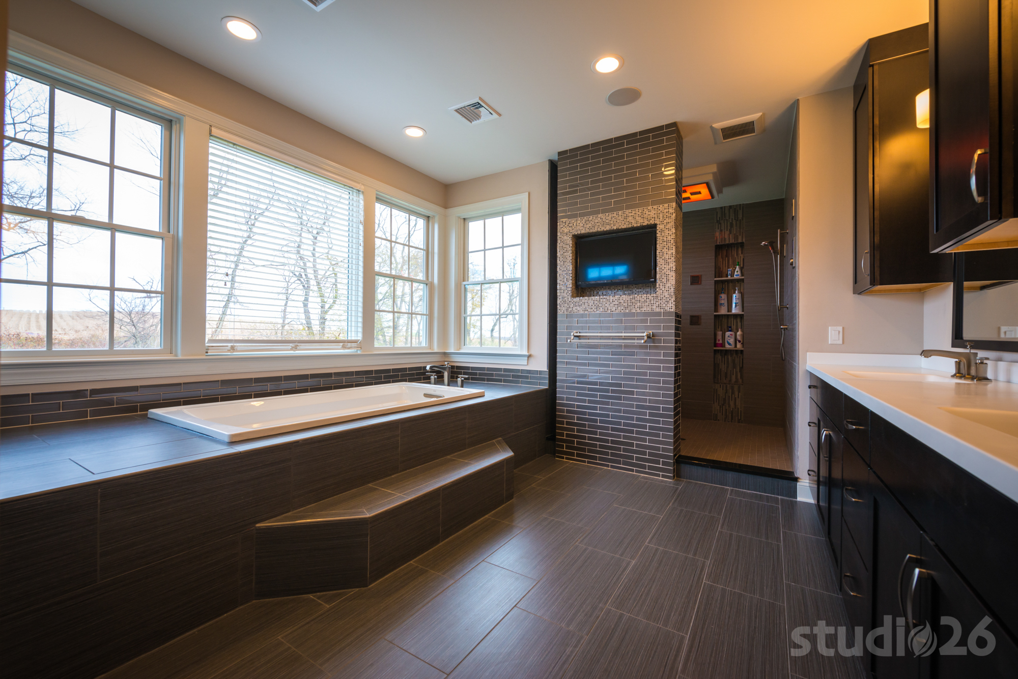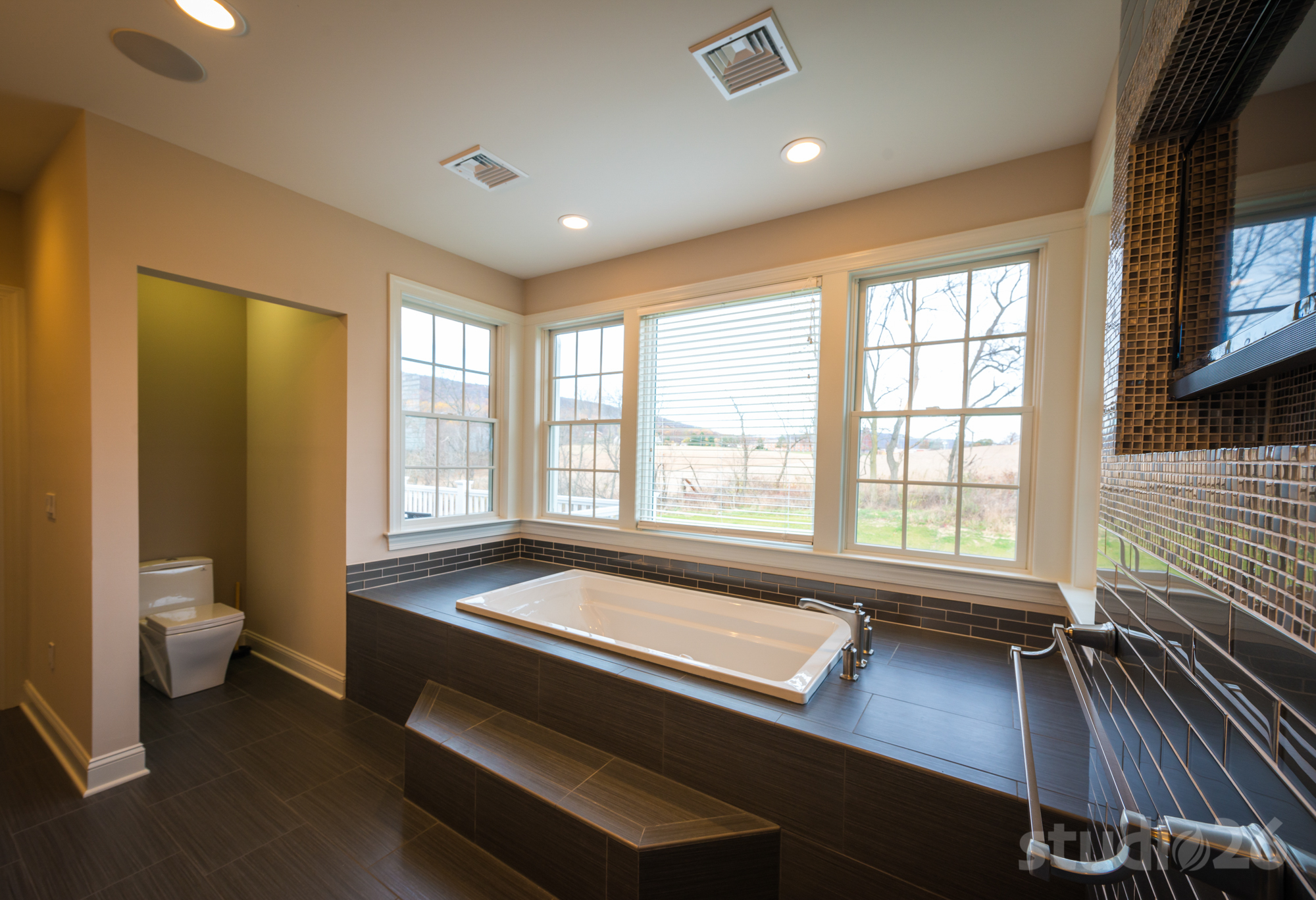 - Expansive master suite with its own ‘foyer’ and window seat, private exterior balcony, large walk-in closet, and luxurious master bathroom including a soaking tub, dual vanities, and custom spa shower