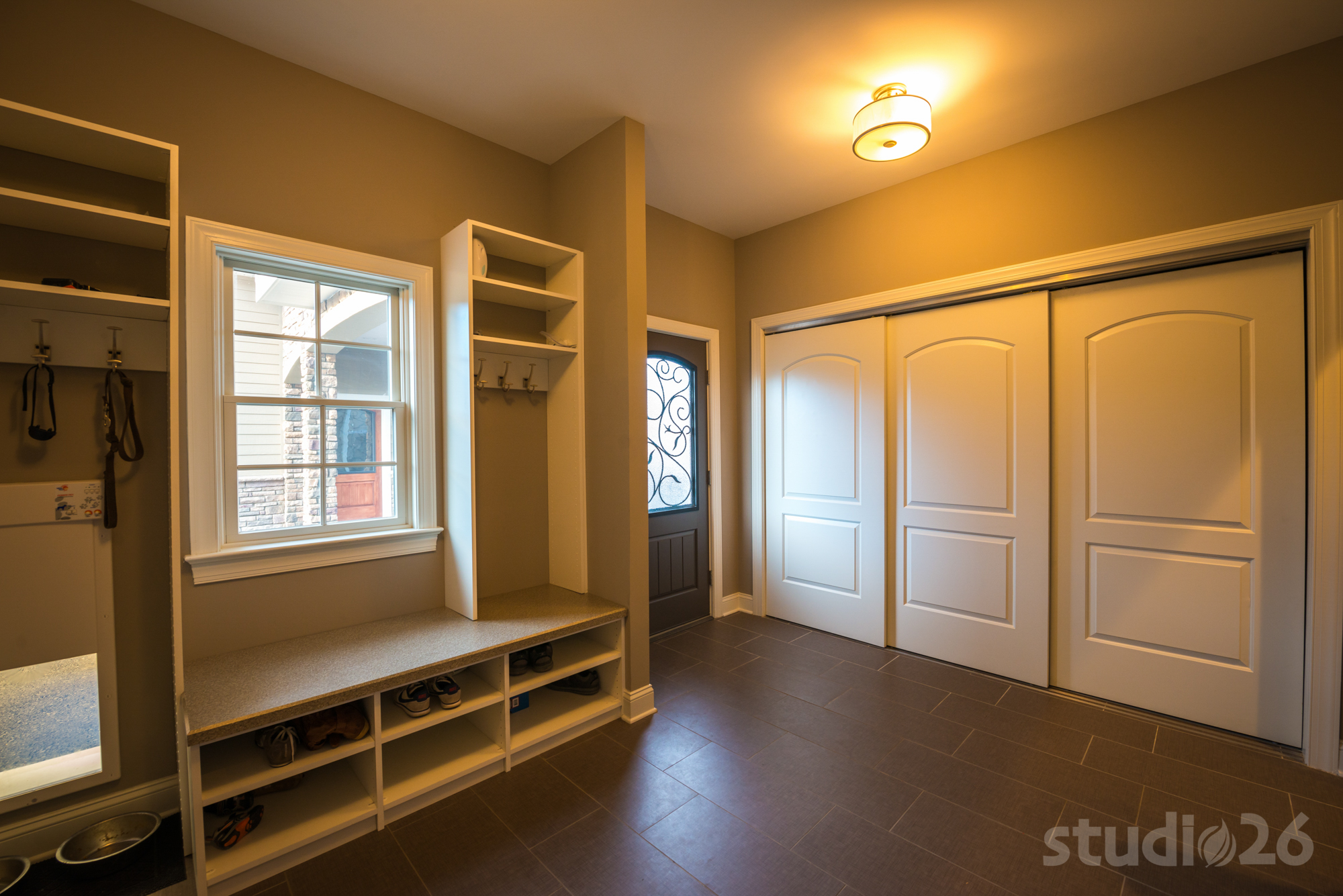 - Automated (collar-activated), in-wall doggy door located in the tile-floored mud room