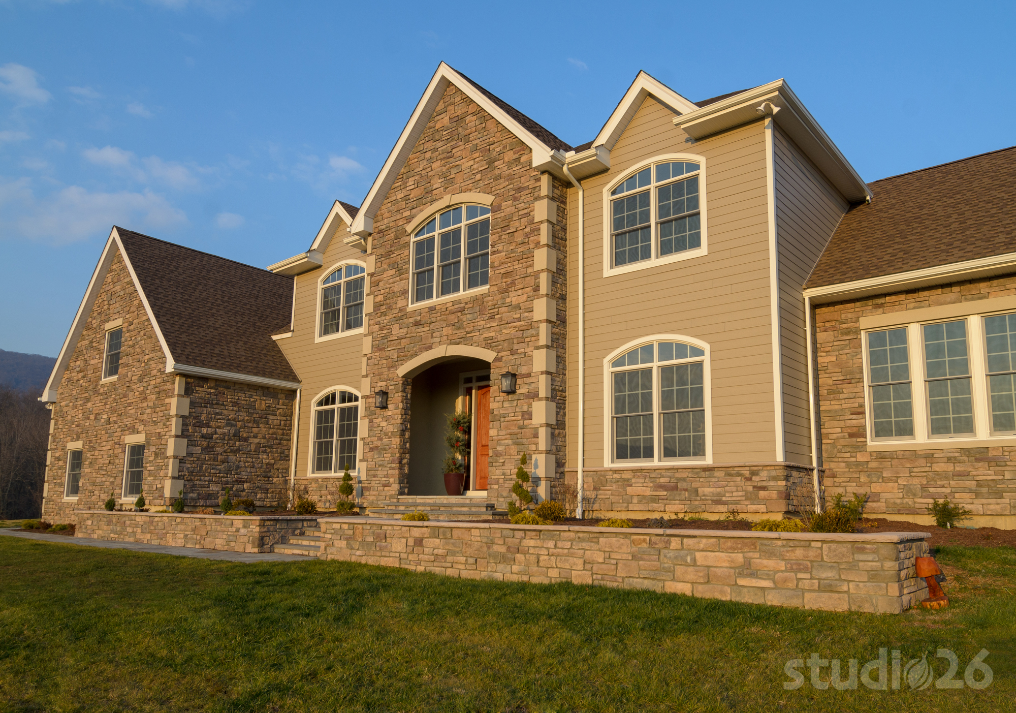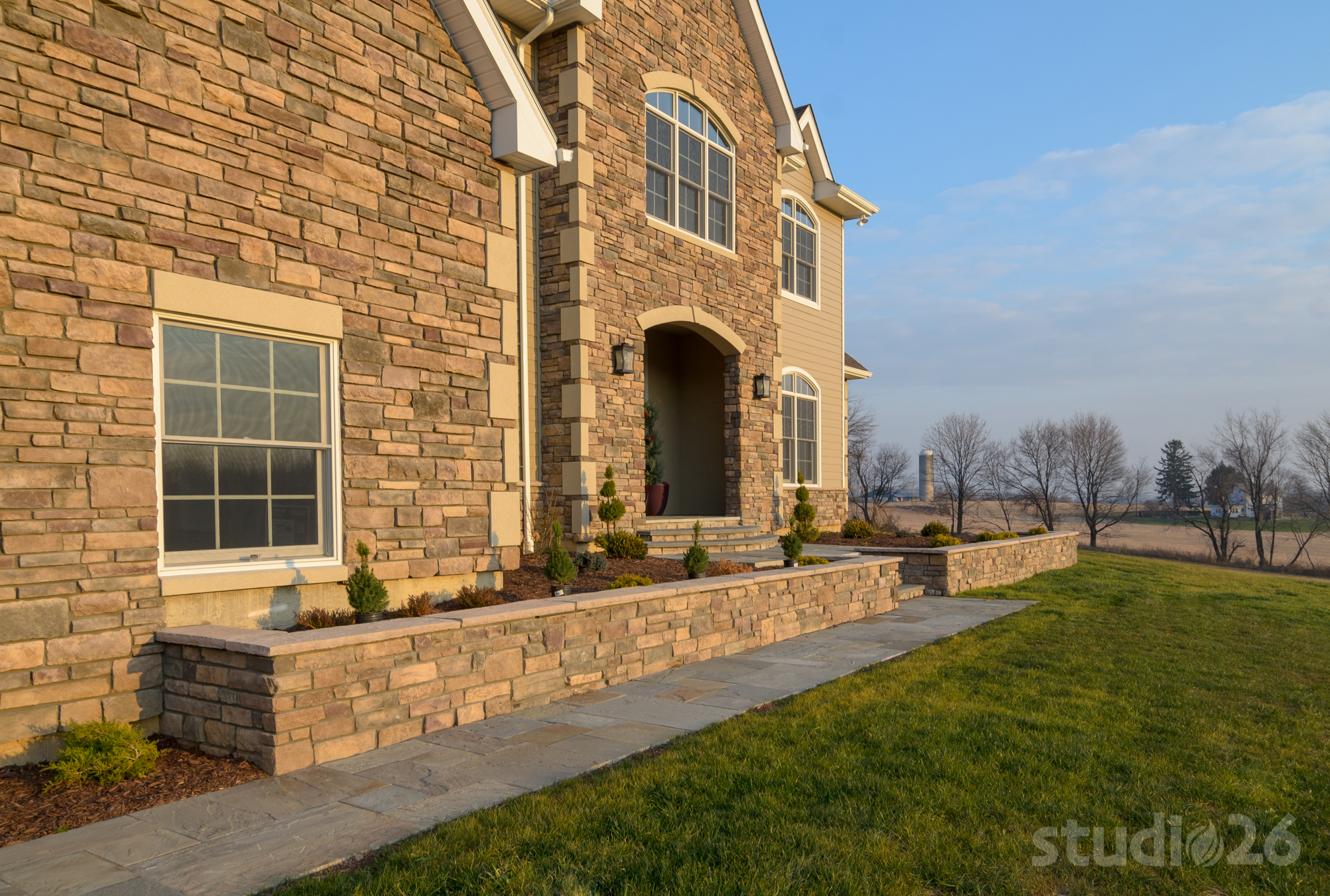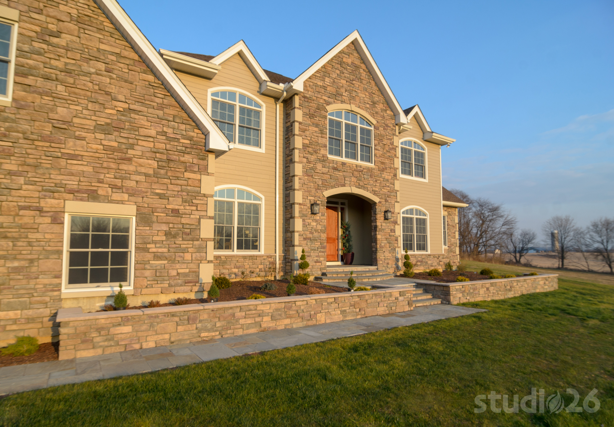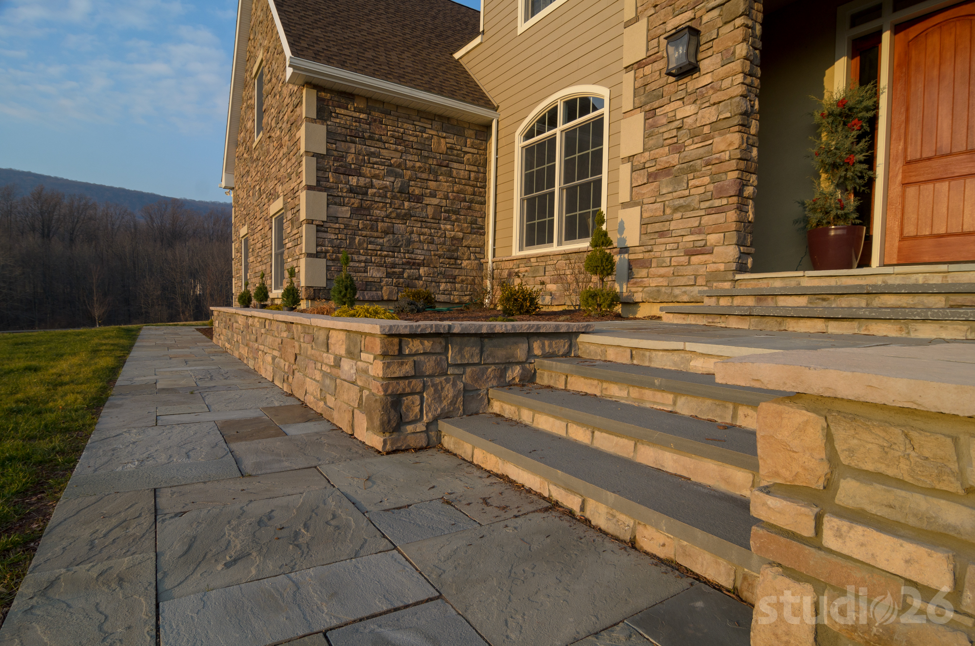 Stone Veneer, Fiber Cement Siding, Composite Decking, Flagstone Walkway & Front Patio