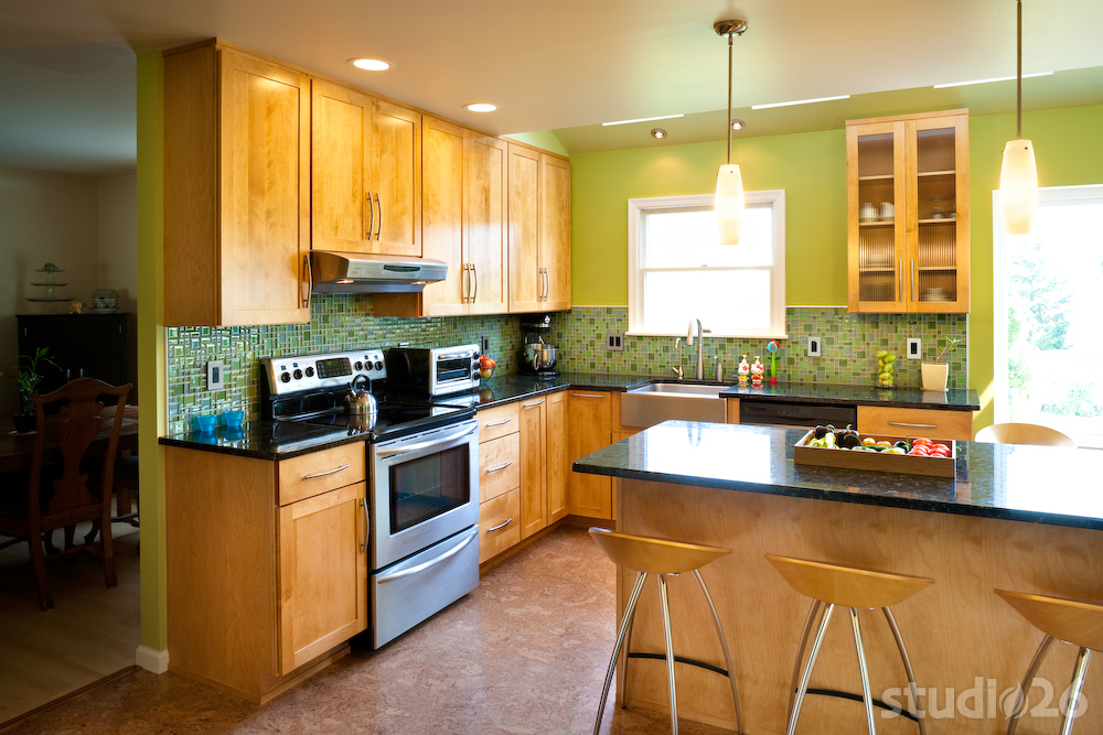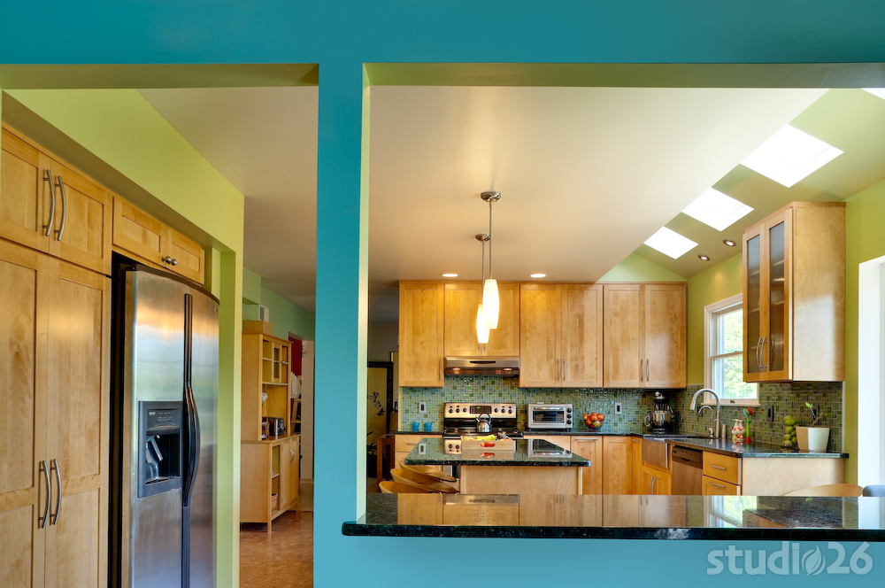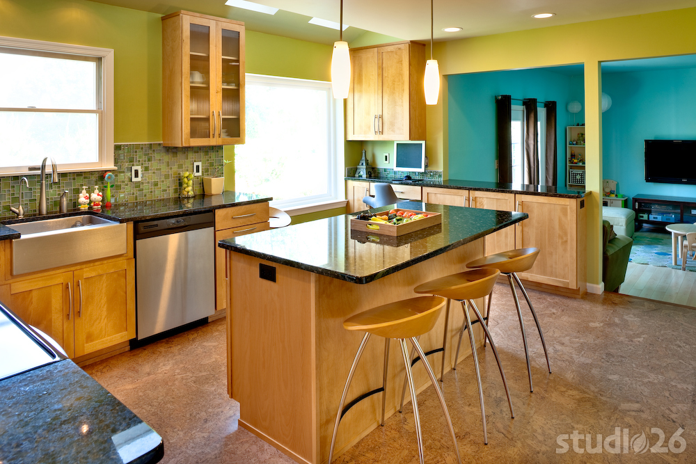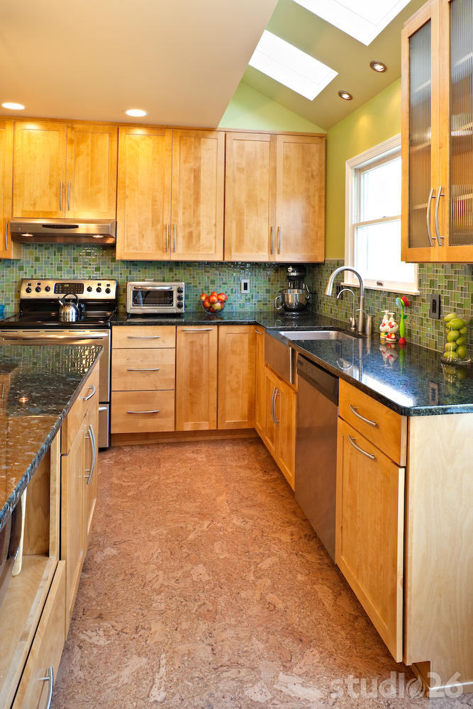 THREE – The last and perhaps most commanding challenge was to bring the entire project together by pleasing the client’s visual appetite and by delivering a kitchen that boasted a soft modern appeal. The custom birch cabinetry, with its clean lines and gently curved hardware, plays a critical role in anchoring the overall composition of the room. A contemporary glass tile backsplash, lively cork floor, stainless steel accents (appliances, plumbing fixtures, hardware, lighting, trim, and wall plates), and colorfully painted walls that reflect the cheerful personality of the client complete this fresh, yet functional expansive space.