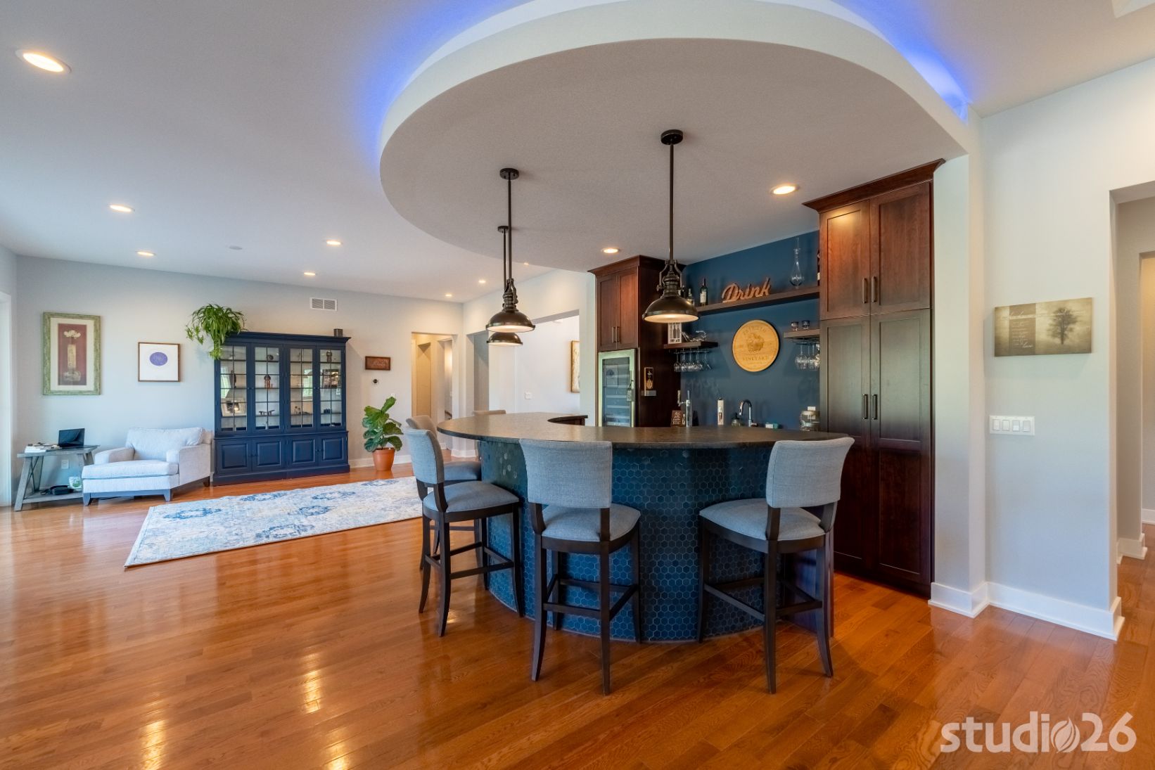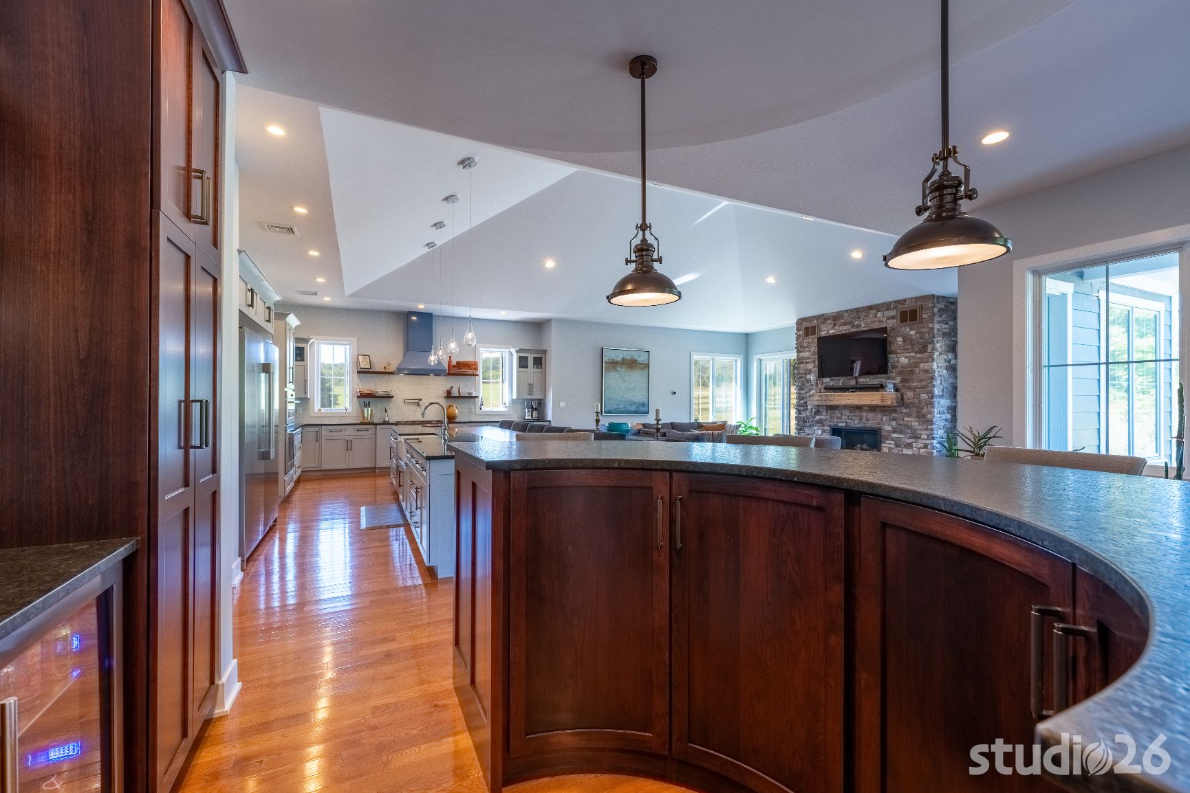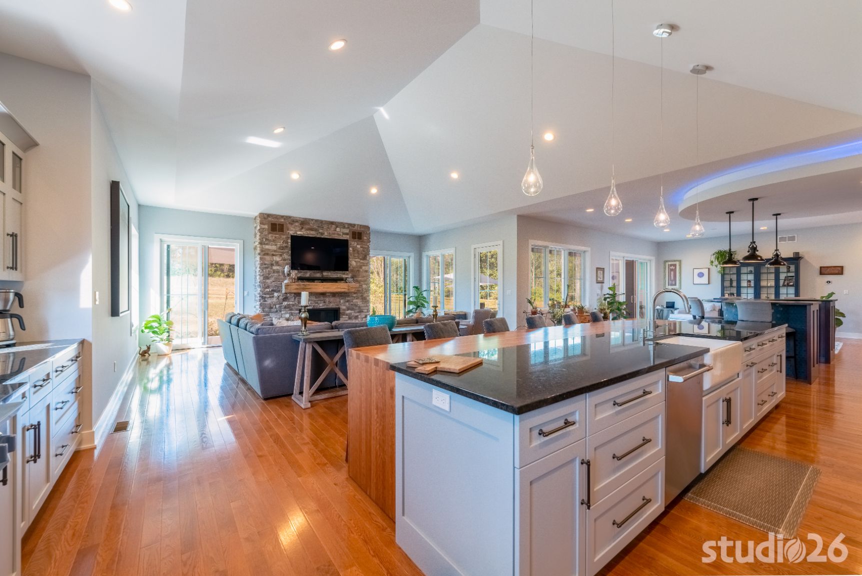 Upon entering the home, guests are welcomed into a tall inviting foyer with a charming view into the adjacent dining room. Stepping deeper into the home reveals a quite spacious sequence of spaces – a sitting room, bar, kitchen, and great room – each with natural light joyfully flooding in and each directly accessible to the enchanting exterior patios and rusticated natural landscape beyond. Entertaining with friends and family here is a real enjoyable treat. Enjoy a freshly poured draft pint at the distinctive half-circle bar with custom curved cabinetry; which is further anchored in the room by an accompanying semicircular RGBW illuminated cove overhead. And in the home’s expansive kitchen, prepare a special feast while chatting away with guests who are sitting at the custom integrated wood table with expertly dovetailed downturn ‘legs’. From there, adjourn to the great room with its cathedral ceiling and commanding stone fireplace to enjoy relaxing conversation or cuddle time together on those movie nights!