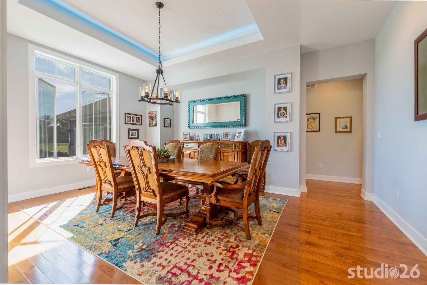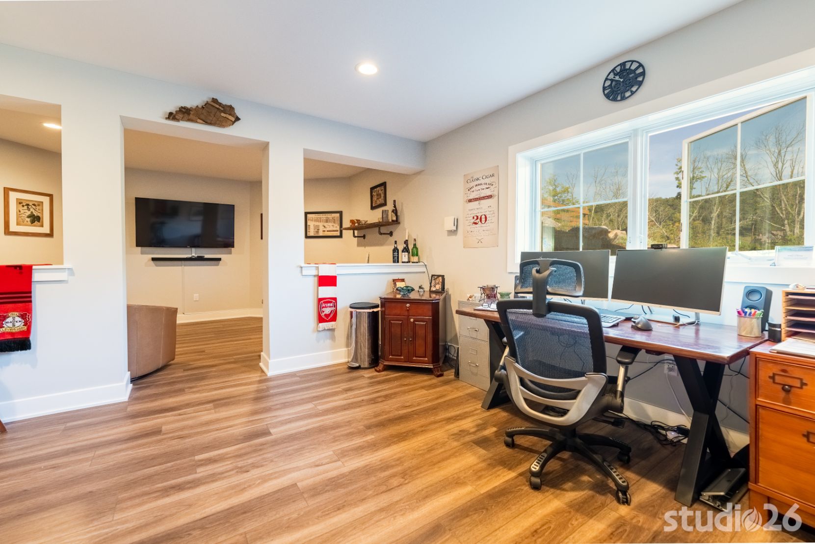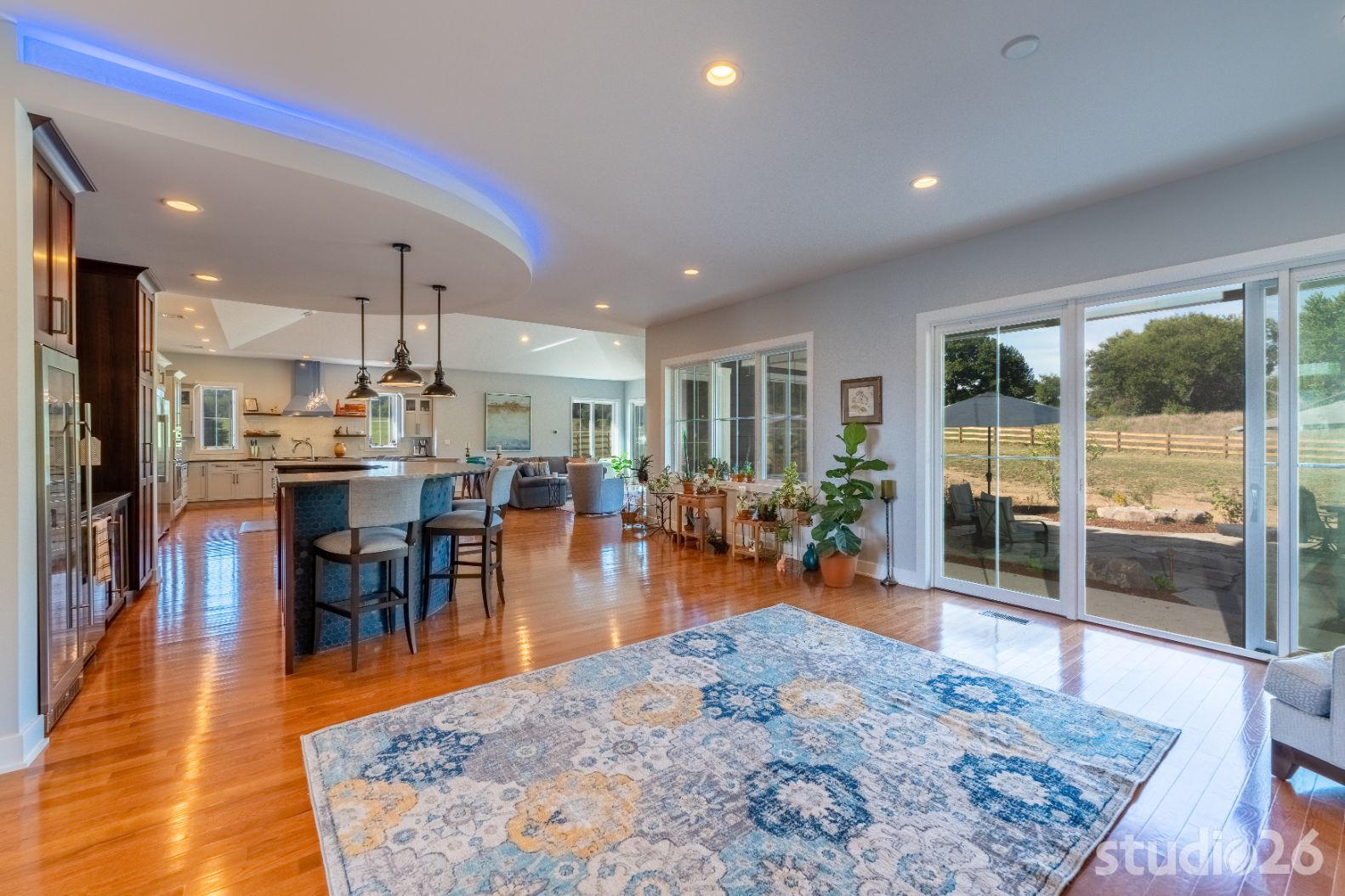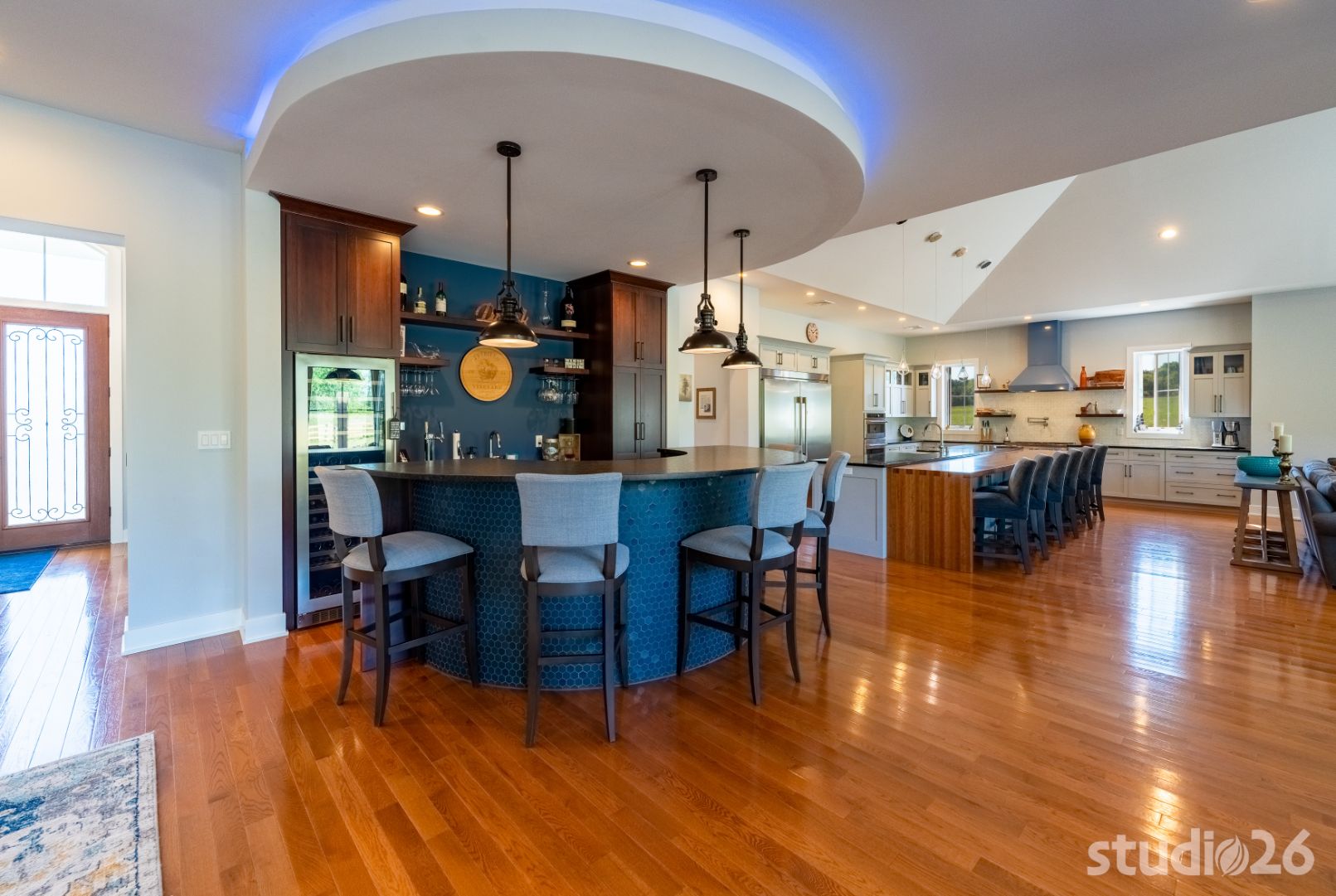 Upon entering the home, guests are welcomed into a tall inviting foyer with a charming view into the adjacent dining room. Stepping deeper into the home reveals a quite spacious sequence of spaces – a sitting room, bar, kitchen, and great room – each with natural light joyfully flooding in and each directly accessible to the enchanting exterior patios and rusticated natural landscape beyond. Entertaining with friends and family here is a real enjoyable treat. Enjoy a freshly poured draft pint at the distinctive half-circle bar with custom curved cabinetry; which is further anchored in the room by an accompanying semicircular RGBW illuminated cove overhead. And in the home’s expansive kitchen, prepare a special feast while chatting away with guests who are sitting at the custom integrated wood table with expertly dovetailed downturn ‘legs’. From there, adjourn to the great room with its cathedral ceiling and commanding stone fireplace to enjoy relaxing conversation or cuddle time together on those movie nights!